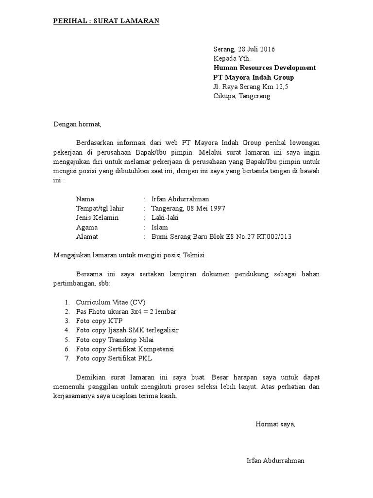 Contoh Surat Lamaran Kerja Pt Mayora Tangerang