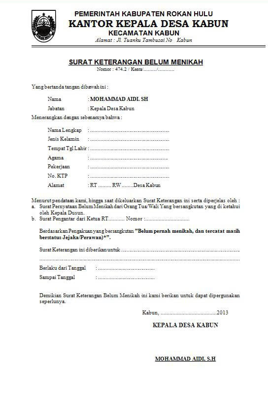 Contoh surat pernyataan orang tua setiap anak tentu akan menjadi tanggung jawab orang tua. Contoh surat keterangan belum menikah ada kalanya sebuah informasi lowongan pekerjaan dikhususkan bagi pelamar lajang. Contoh surat keterangan belum menikah lagi dibawah ini desainundanganku membagikan gambar contoh surat keterangan belum menikah lagi yang desainundanganku kira cukup bagus dengan artikel utama 30 contoh surat pernyataan belum menikah terbaru 2019. Surat keterangan belum menikah dianggap penting untuk meresmikan status lajang seseorang.