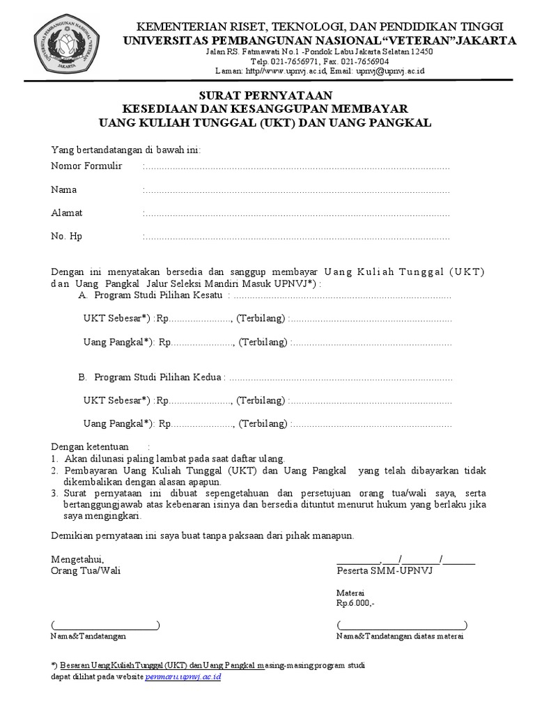 Contoh Surat Pernyataan Kesanggupan Pembayaran Ukt