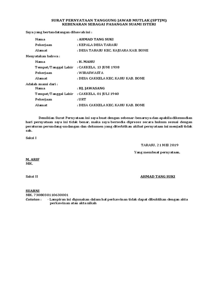 Contoh Surat Pernyataan Tanggung Jawab Mutlak Sptjm Kebenaran Sebagai Pasangan Suami Istri