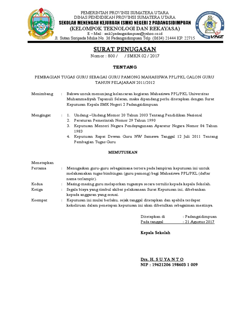 Contoh surat tugas guru pamong ppl. Contoh surat lengkap surat ijin surat lamaran kerja perintah resmi permohonan keterangan undangan dinas niaga jalan dukungan pengantar. Nah bagi anda yang ingin mengetahui bentuk surat tersebut di bawah ini saya berikan beberapa contoh surat tugas dari kepala sekolah untuk guru pelaksana tugas. Bagi guru yang ditetapkan menjadi guru pamong ppg maka secara otomatis sekolah tempat tugas guru tersebut akan menjadi sekolah mitra perguruan tinggi penyelenggara ppg prajabatan tahun 2020. Dosen pembimbing guru pamong drs.