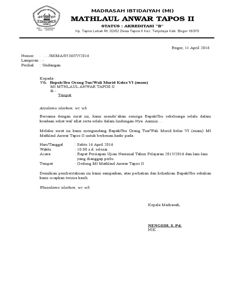 Contoh Surat Undangan Rapat Untuk Orang Tua Wali Murid Doc