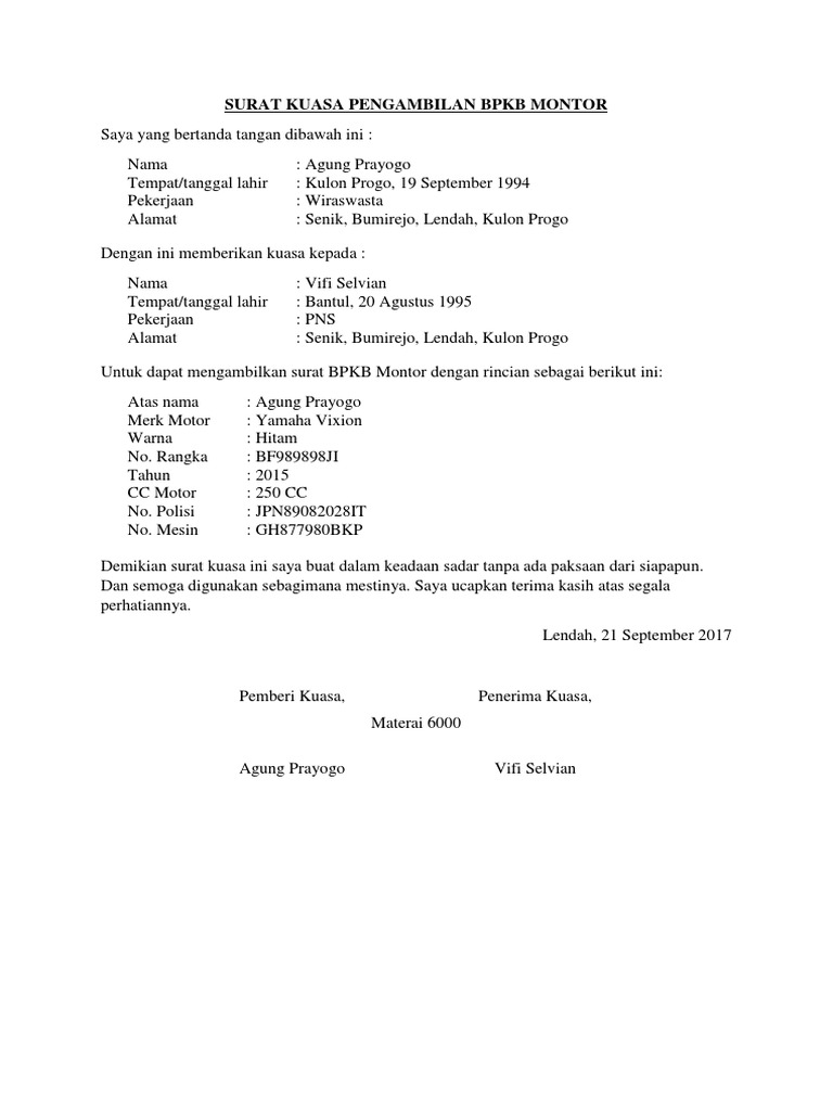Apa itu surat kuasa. Berikut ini adalah surat kuasanya 1. Mujiono tempat tanggal lahir. Contoh surat kuasa pengambilan bpkb jika anda ingin mewakili orang lain untuk mengambil bpkb entah di fif adira samsat leasing ataupun bank maka anda membutuhkan surat kuasa pengambilan bpkb.