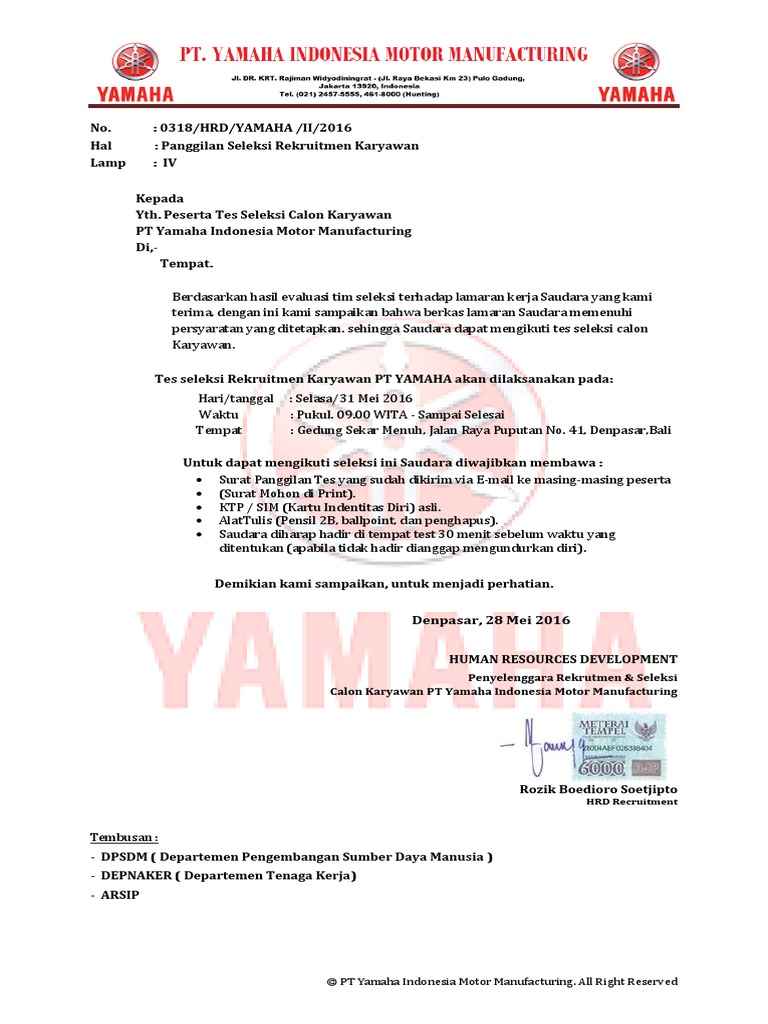 Surat lamaran kerja pt yamaha pulogadung. Pt yamaha music manufacturing indonesia pulogadung jakarta timur pt yamaha music manufacturing indonesia cikarang operator produksi pt. Apabila anda berminat dan memenuhi persyaratan dari pt ymmi pulogadung diatas silahkan kirimkan surat lamaran kerja anda via pos ke alamat berikut. Maka tidak heran ketika banyak orang membidik perusahaan dengan status pt perseroan terbatas. Contoh surat lamaran kerja pt yamaha pulogadung posted by mata on sunday may 19 2019 surat lamaran kerja pt yamaha indonesia motor manufacturing surat lamaran kerja pt yamaha cara membuat surat lamaran.