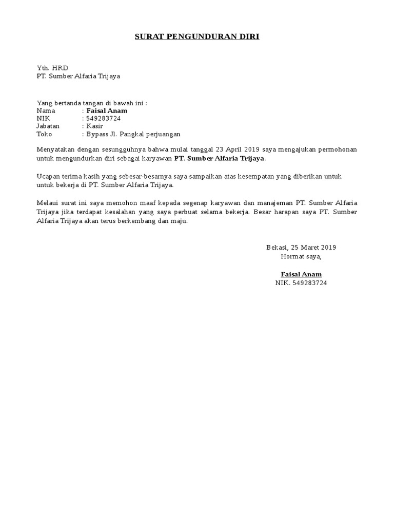 Surat pengunduran diri karyawan alfamart. Bapak ilham firdaus ds hrd manager pt. Berikut ini adalah surat pengunduran diri dari alfamart dan indomaret jika anda sedang mencari contoh surat pengunduran diri silahkan copy dan diedit saja surat pengunduran diri ini sesuai keperluan anda. Contoh surat pengunduran diri karyawan indomaret alfamart alfamidi indomaret ataupun alfamidi dan alfamart merupakan perusahaan retail yang berkembang dengan pesat di indonesia. Contoh surat pengunduran diri 1 surat pengunduran diri bogor 21 juni 2012 kepada yth pt.