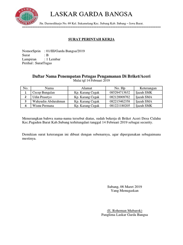 Surat perintah kerja security. Oleh sebab itu surat perintah kerja maupun tugas bisa diartikan sebagai surat resmi perusahaan maupun instansi yang bermaksud untuk memerintahkan pekerjaan kepadanya karyawannya. Dengan adanya surat ini penerima tugas harus bisa melaksanakan tugasnya dengan sebaik baiknya. Itulah contoh surat perintah kerja pengadaan barang dan jasa yang dapat admin kumpulkan. 24 3 2020 dalam rangka memenuhi keperluan perusahaan maka direktur.