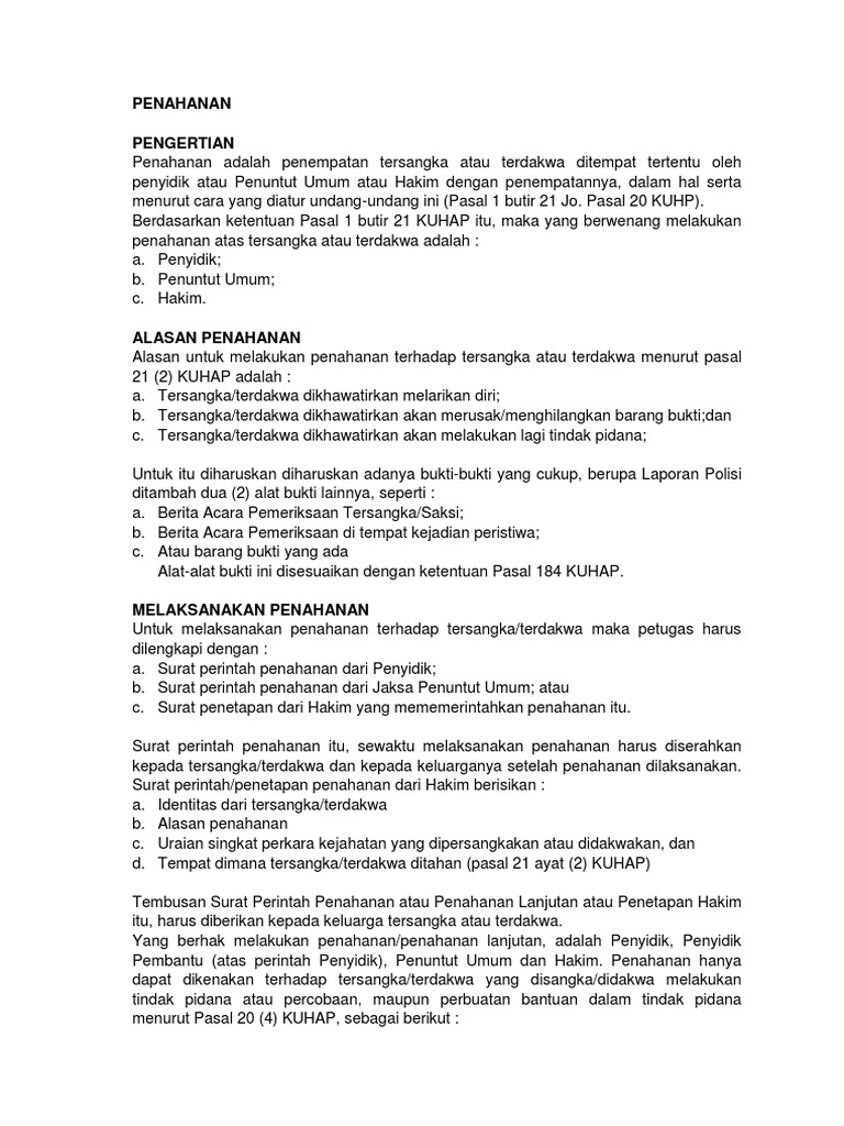 8 tahun 1981 tentang kitab undang undang hukum acara pidana kuhap. Penahanan dikenakan kepada tersangka atau terdakwa yang melakukan tindak pidana. 4 maka perlu mengeluarkan surat perintah ini. Pasal 21 ayat 1 kuhap menyatakan perintah penahanan atau penahanan lanjutan dilakukan terhadap seorang tersangka atau terdakwa yang diduga keras melakukan tindak pidana berdasarkan bukti yang cukup dalam hal adanya keadaan yang menimbulkan.